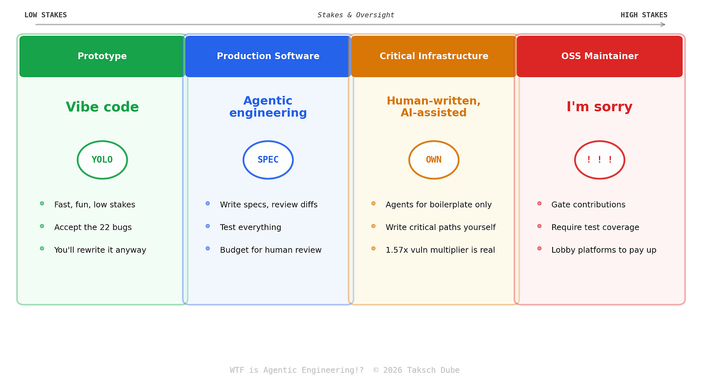 Production? Agentic engineering. Write specs. Review diffs. Test everything. Limit retries. Scan for security. Budget for human review time.