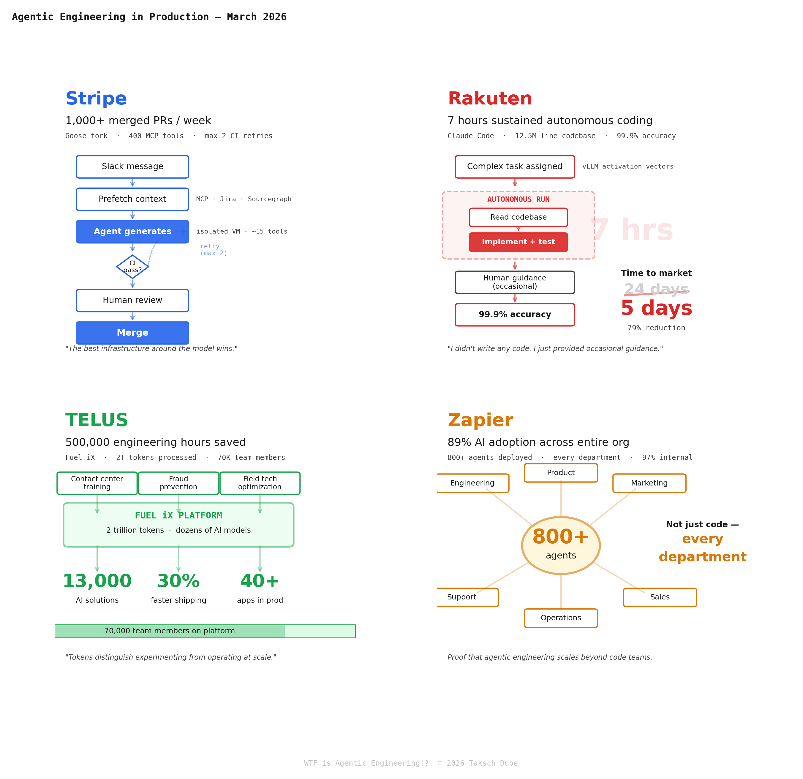 The pattern: the agent is a commodity. The harness — isolated environments, curated tool access, CI/CD gates, retry limits, human review — is the moat. Stripe and Rakuten prove it works for code. TELUS and Zapier prove it scales beyond it.