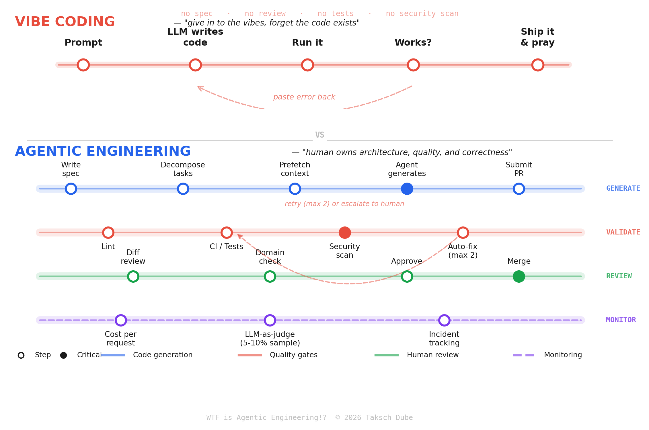 Agentic engineering: You design the system. AI agents execute under structured oversight. You review every diff. You test relentlessly. The AI is a fast but unreliable junior developer who needs constant supervision.