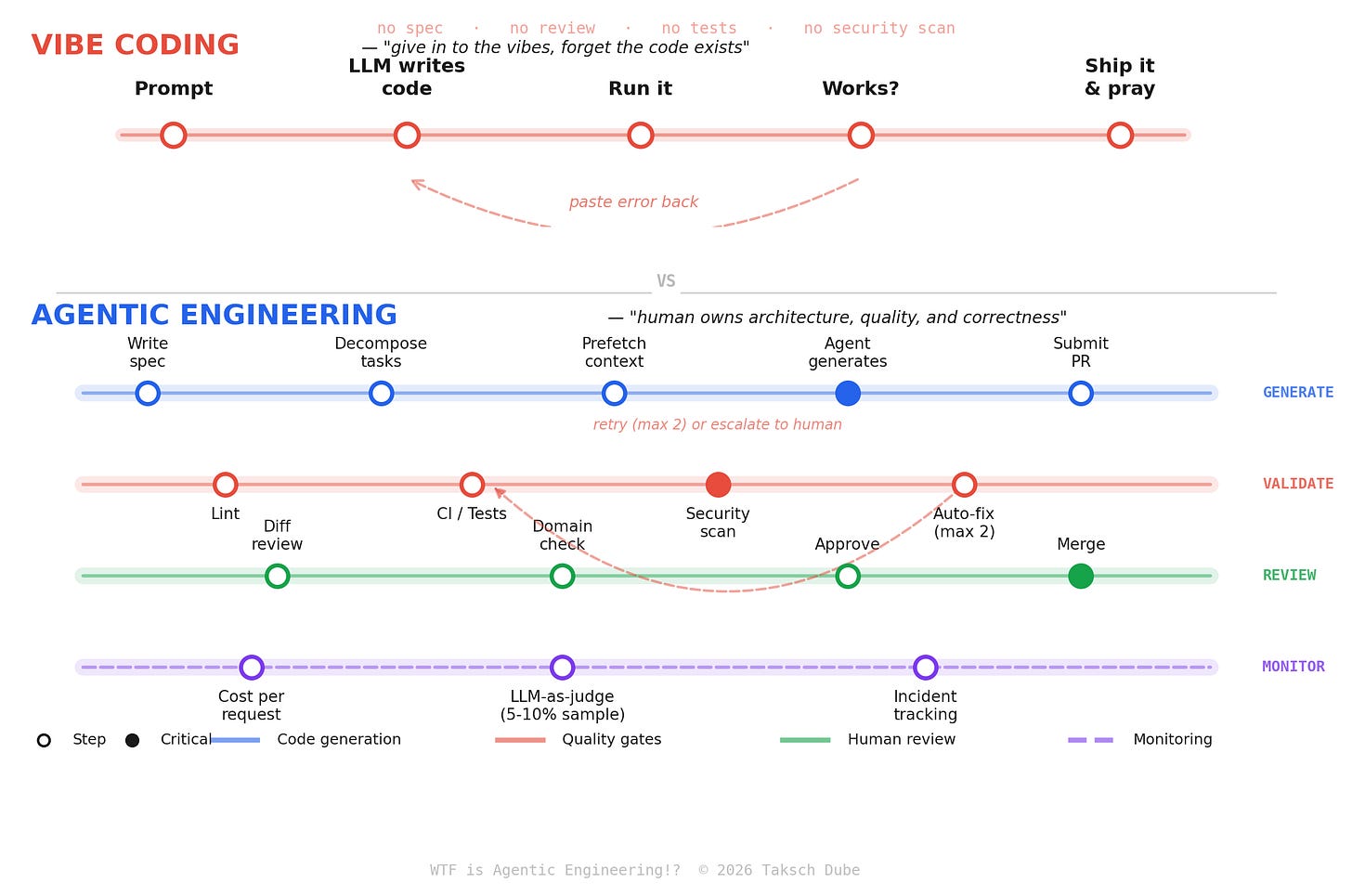 As Addy Osmani puts it: “Vibe coding = YOLO. Agentic engineering = AI does the implementation, human owns the architecture, quality, and correctness.”