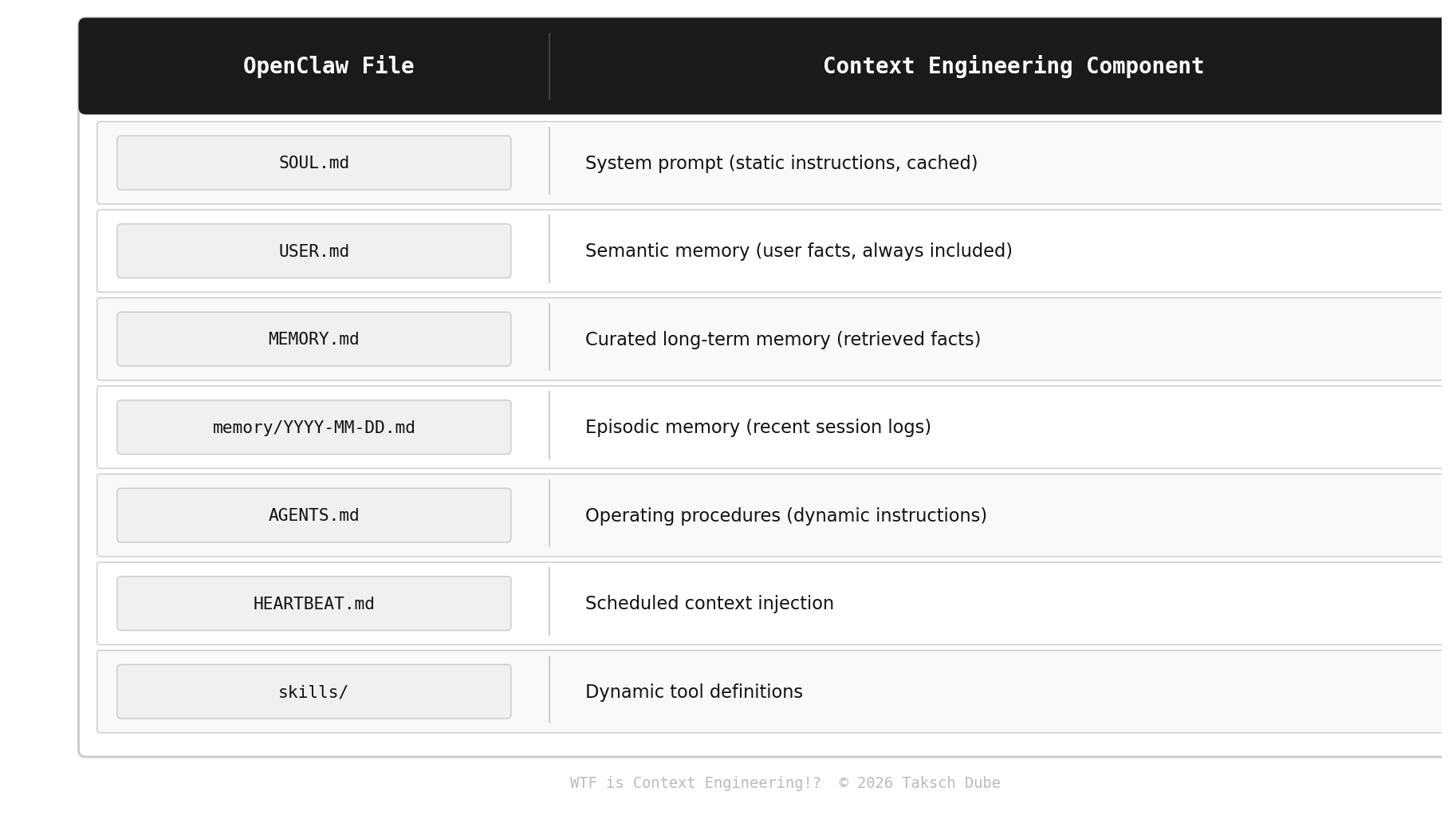 Since we just covered OpenClaw in depth, let's close the loop. OpenClaw's architecture is basically a manual context engineering system built with markdown files:
