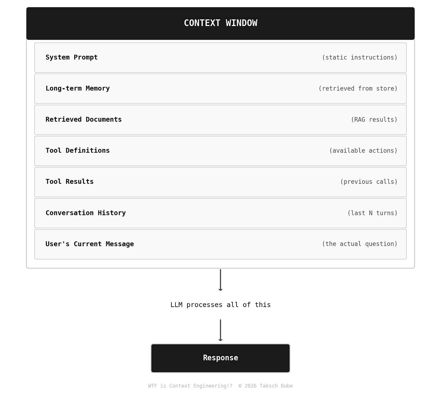 The context window is everything the model sees before generating a response. Not just your prompt. Everything: